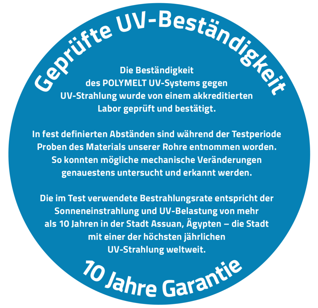 POLYMELT UV ist das weltweit erste geprüfte UV-beständige PP-R Kunststoffrohr-System, bestehend aus Rohr und Fitting, das wie Standard-PP-R verschweißt werden kann. POLYMELT PP-R Rohre sind für ihre außergewöhnliche Langlebigkeit und Widerstandsfähigkeit bekannt und dank ihrer UV-Beständigkeit trotzen sie selbst extremen Wetterbedingungen und garantieren eine lange Lebensdauer der Anlage.